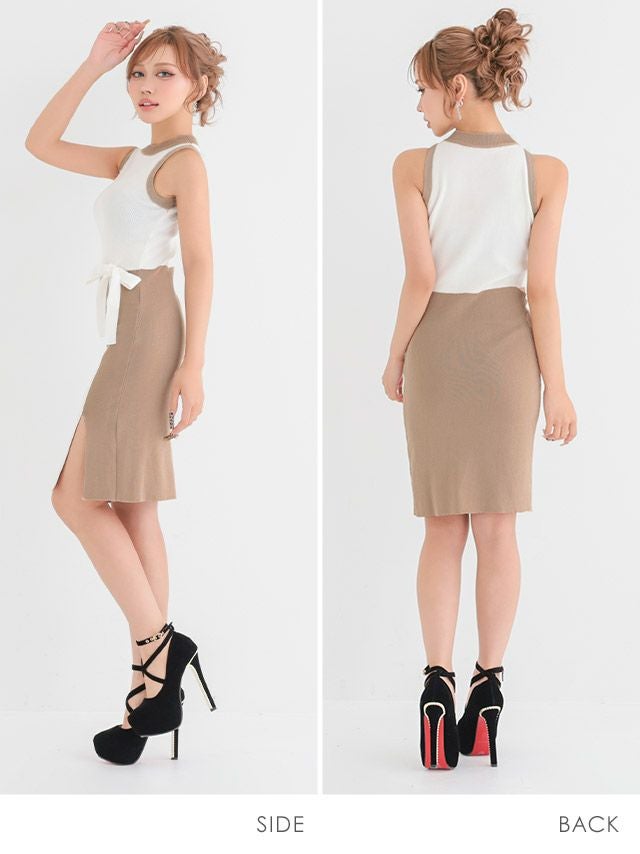 3. ミニドレス ノースリーブ ニット ストレッチ 同伴 バイカラー シンプル 安い プチプラ タイト 胸元カバー キャバドレス (きぃぃりぷ着用) [th-mdtc2059]