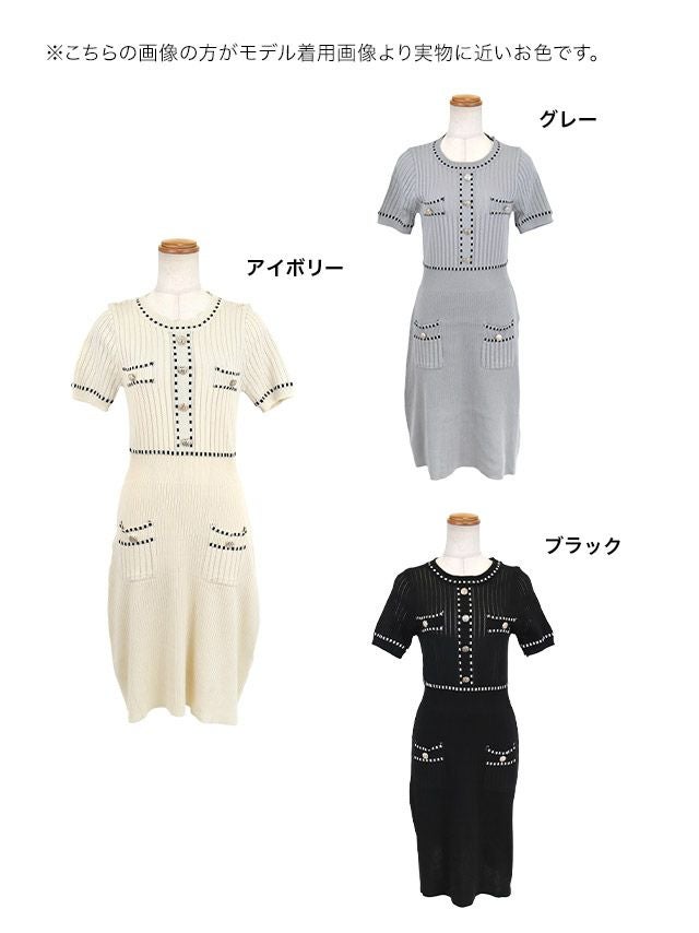 ステッチデザインがおしゃれ♪ 膝丈ドレス プチプラ ニット ストレッチ ワンピース 半袖 同伴 ブラジャーのまま ステッチ 胸元カバー 安い キャバドレス (あん着用) [th-mdtc94238]