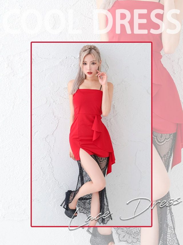 キャミソールブラックレース切替サイドスリットタイトロングドレス