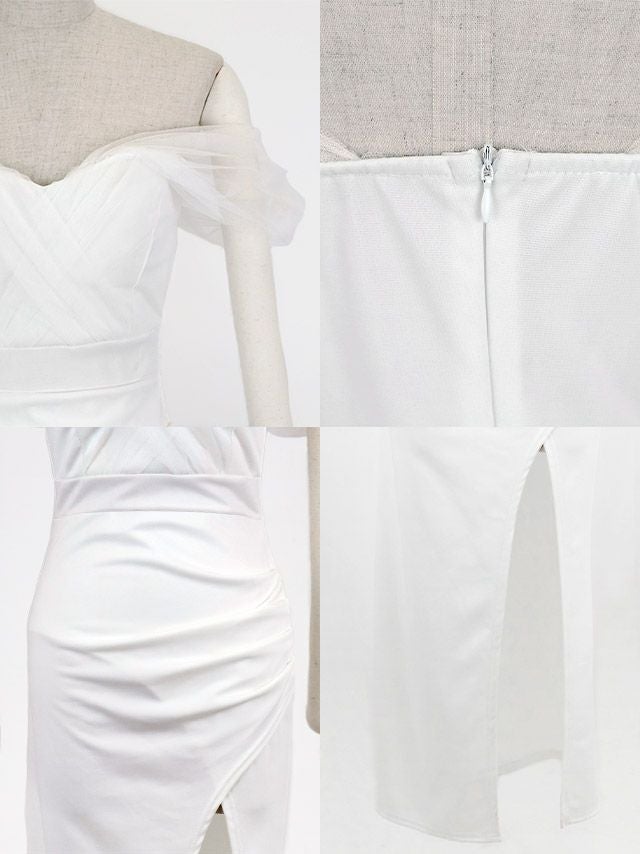 背中魅せ シースルー 2Way オフショルダー ワンカラー ラップ スリット入り タイトロングレス