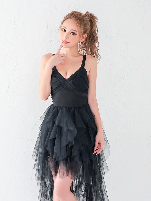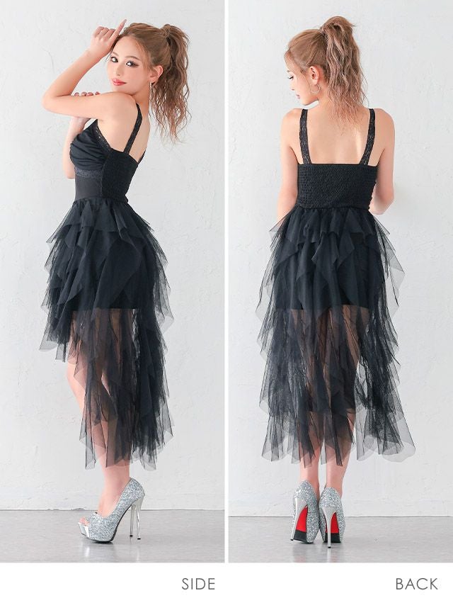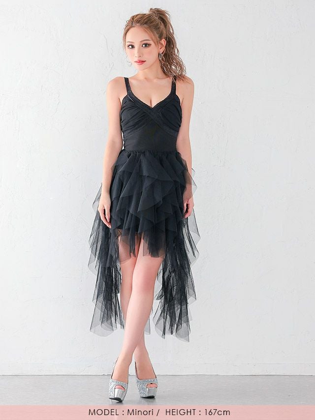 ボリュームスカートでお目立ち存在感♪ 安い Aラインロングテール キャミソール オーガンジー シンプル 大人 背中魅せ 谷間 キャバドレス (波北かほ着用)
