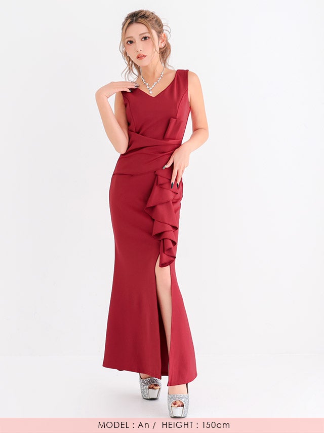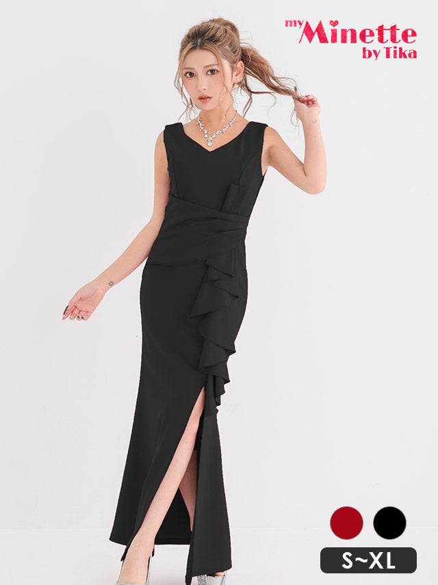 4/1新作★サイドのフリルで華やかさ満載♪ ロングドレス プチプラ ノースリーブ セクシー スリット 新人 背中魅せ Aライン 黒 XL ホステス 上品 キャバドレス (あん着用) [th-ld6813a]