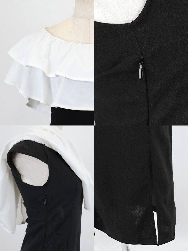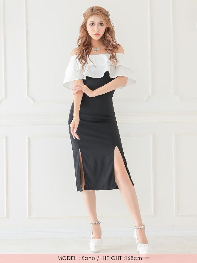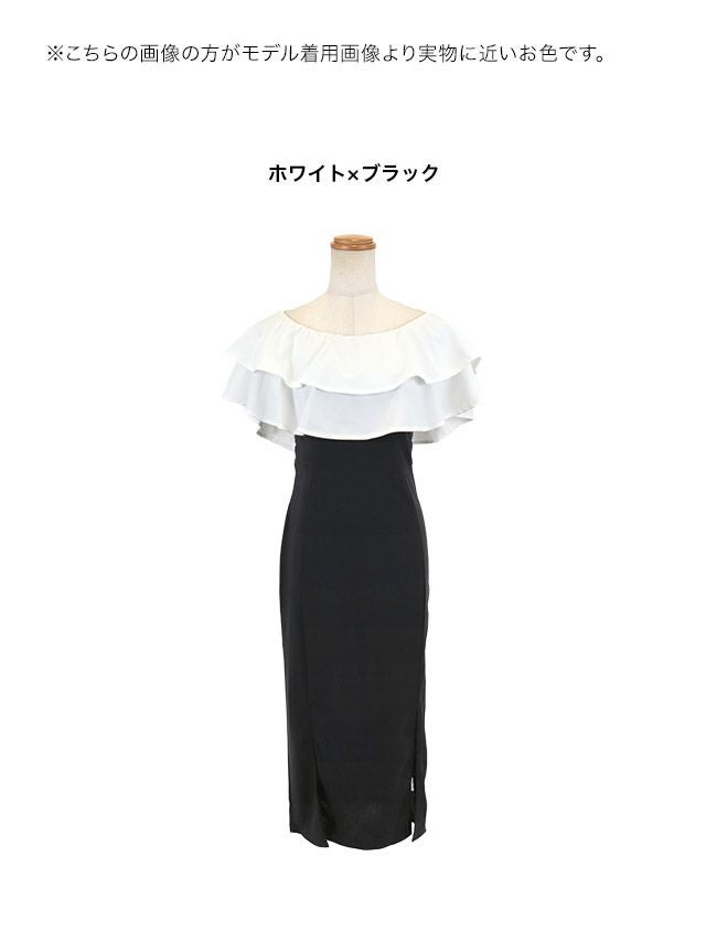 背中魅せ バイカラー オフショルダー 胸元フリル 袖 サイドスリット入り タイトロングドレスのメイン画像