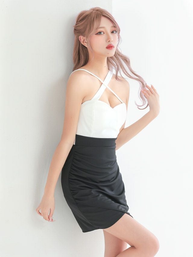 3. クロスネックバイカラーラップ風アシメタイトミニドレス (向葵まる着用)