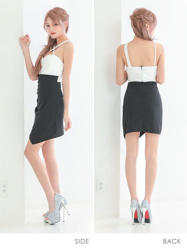 クロスネックバイカラーラップ風アシメタイトミニドレスのメイン画像