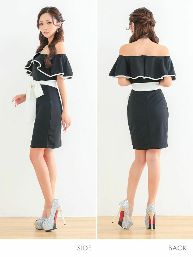 キバイカラー 胸元フリル オフショルダー ウエストリボン タイトミニドレスの全身サイドバック画像