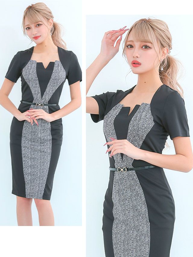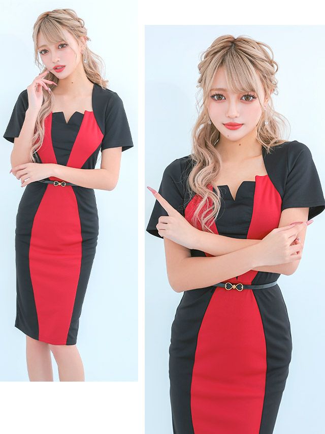 4. [SALE] バイカラー ベルト付き くびれ半袖 タイト膝丈ドレス (中尾みほ着用)