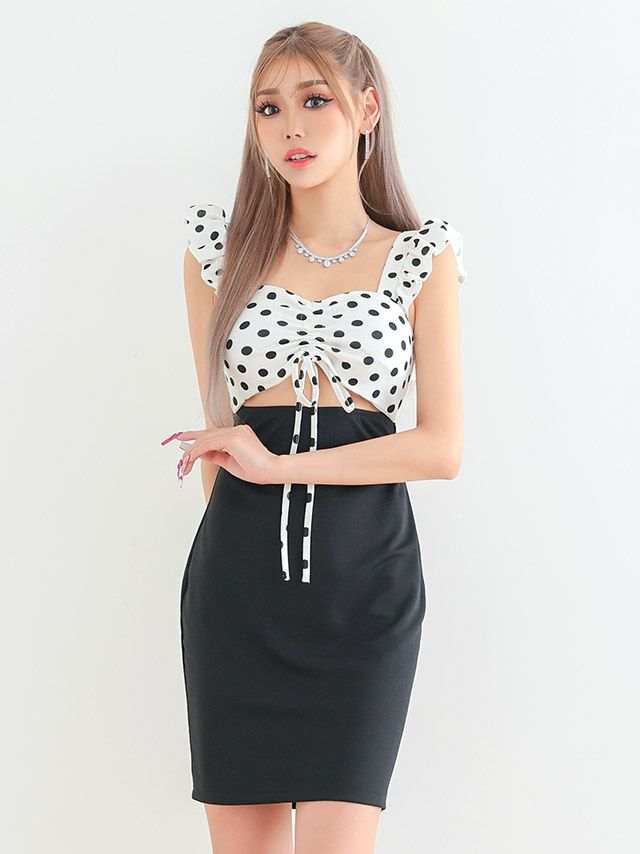 4. フリル ノースリーブ ドット柄 ウエストカット 背中魅せ タイトミニドレス (あおぽん れいたぴ着用)