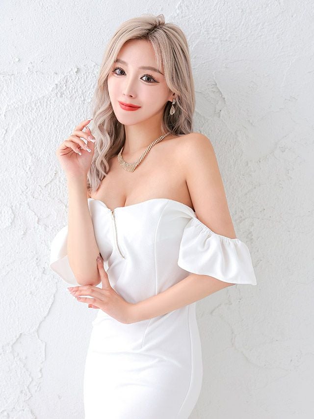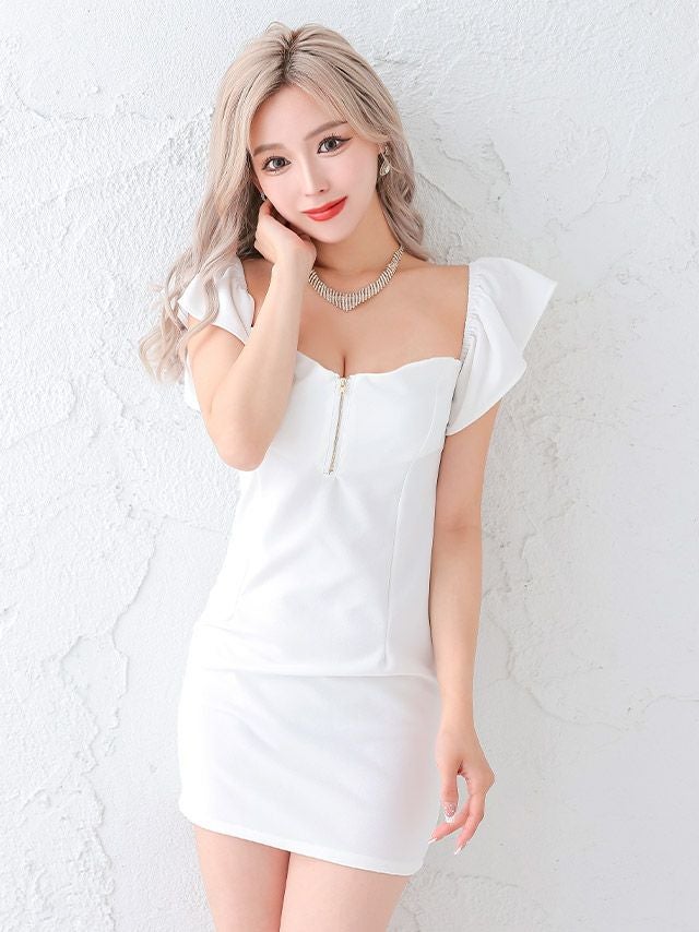 オフショルダーフリル袖バストフロントジップタイトミニドレス