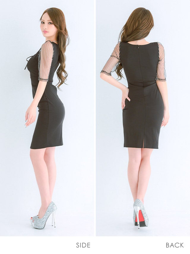 6. 膝丈ドレス プチプラ 袖あり ストレッチ シースルー スクエアネック 同伴 新人 ラウンジ 低身長 二の腕カバー タイト 黒 安い XXL 大きいサイズ キャバドレス (みのり着用) [th-mdd10986]
