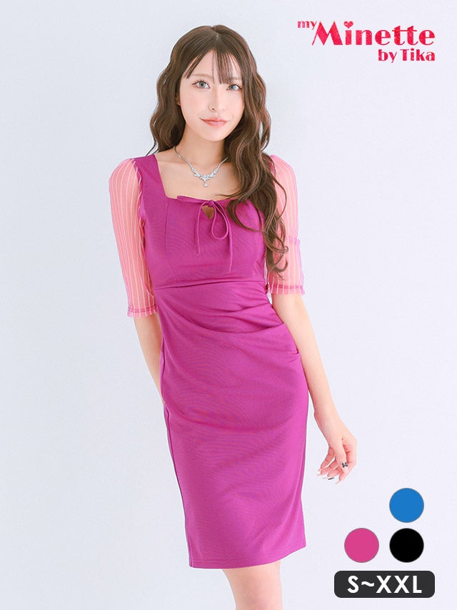 4/22新作★自然に二の腕カバーもできる♪ 膝丈ドレス プチプラ 袖あり ストレッチ シースルー スクエアネック 同伴 新人 ラウンジ 低身長 二の腕カバー タイト 黒 安い XXL 大きいサイズ キャバドレス (みのり着用) [th-mdd10986]