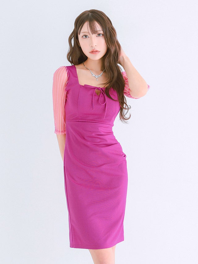 シースルー袖で程よく抜け感をプラスした膝丈ドレス。