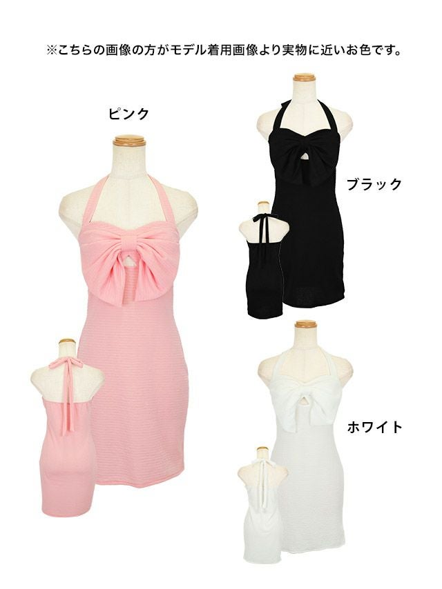 バックスタイルも美しく♪ 胸元リボンカットアウトホルターネックタイトミニドレス (なぎ着用)