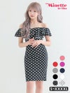 フリルがお洒落に映える♪ 安い タイト膝丈ドレス ホステス オフショルダー 大きいサイズ シンプル 大人 ノースリーブ ストレッチ ブラジャーのまま 2way (なぎ着用)