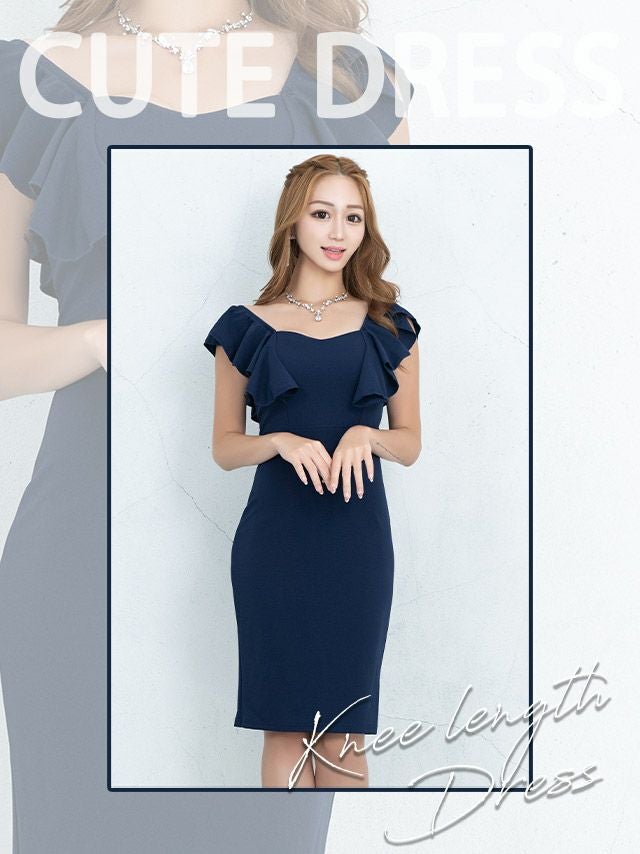 フリル袖ペンタゴンネックタイト膝丈ドレス