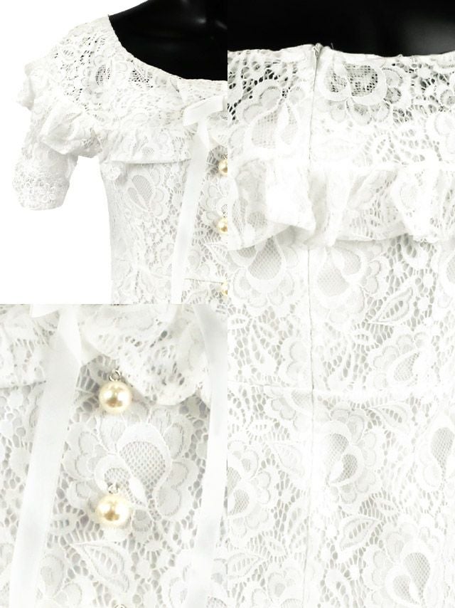 オフショルダー胸元フリルパールボタンレースタイトミニドレス