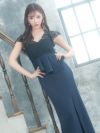 5. 半袖ブラックスカラップレースアシメぺプラム切り替えストレッチタイトロングドレス (Sサイズ~XXLサイズ) (明日花キララ/キャバドレス着用)