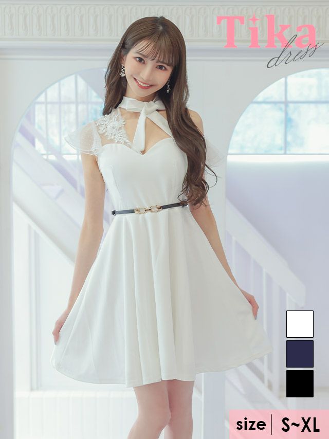 キャバドレス ミニ丈 Aライン 大きいサイズ Tika ティカ チュールフラワーワンショルダーフリル袖ネックリボンバストカットアウトウエストベルト付きフレアミニドレス