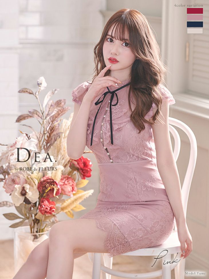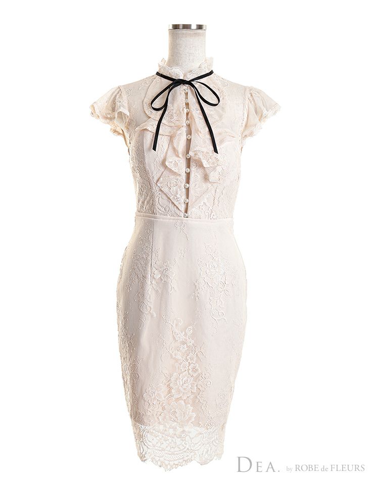 4. [DEA.byROBEdeFLEURS/ディアバイローブドフルール] 高級ネックリボン胸元フリルオールレース半袖タイト膝丈ドレス