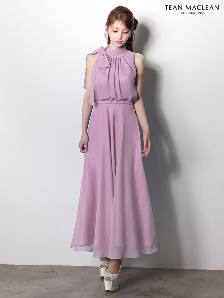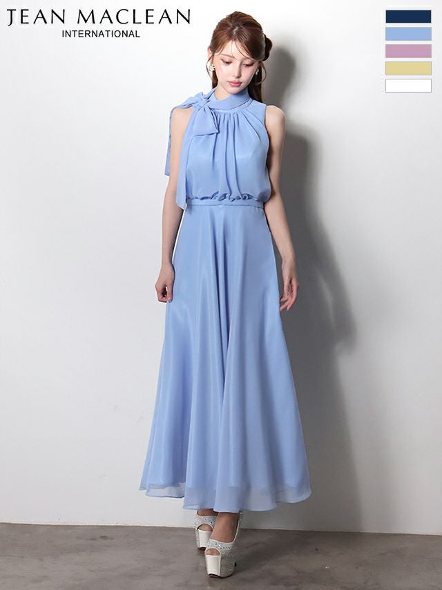 ネックリボンで上品なお顔周りに♡ [JEANMACLEAN/ジャンマクレーン] 高級 ブランド ワンピース Aラインロングドレス ノースリーブ ネックリボン シフォン ワンカラー