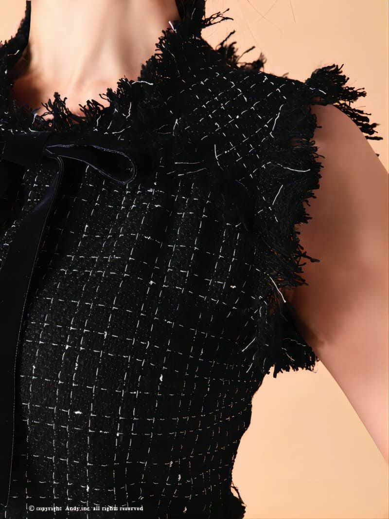 Andy アンディ 高級ネックリボンツイードフリンジアシメワンピースノースリーブタイトミニドレス