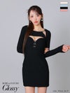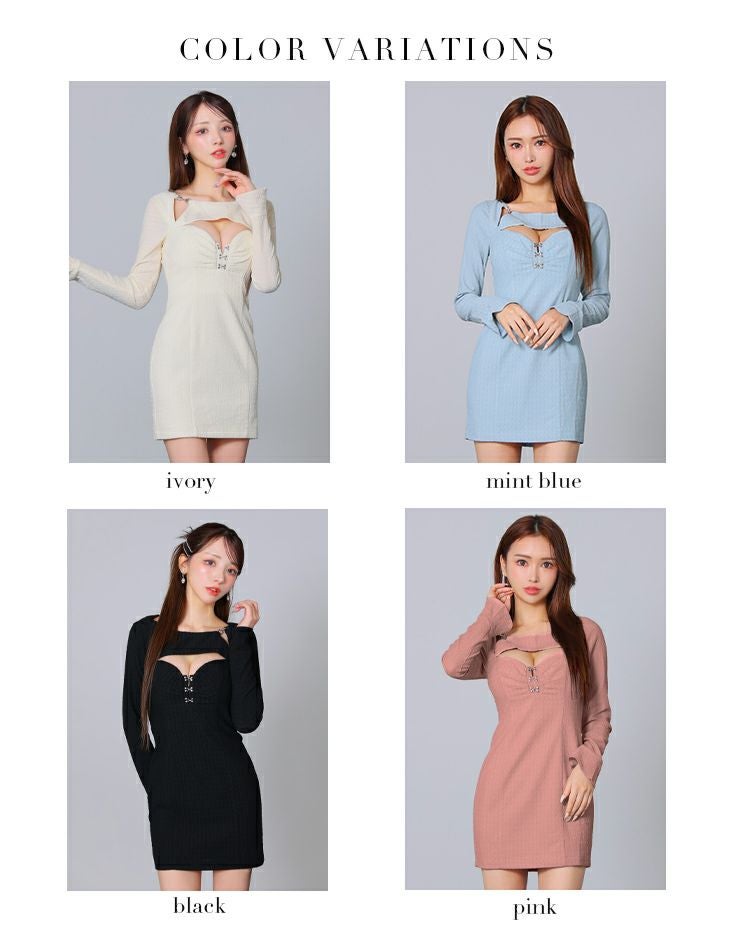 4. [ROBEdeFLEURSGlossy/ローブドフルールグロッシー] 高級 長袖 袖あり バストカット ネックリボン ワッフル 谷間魅せ タイトミニドレス