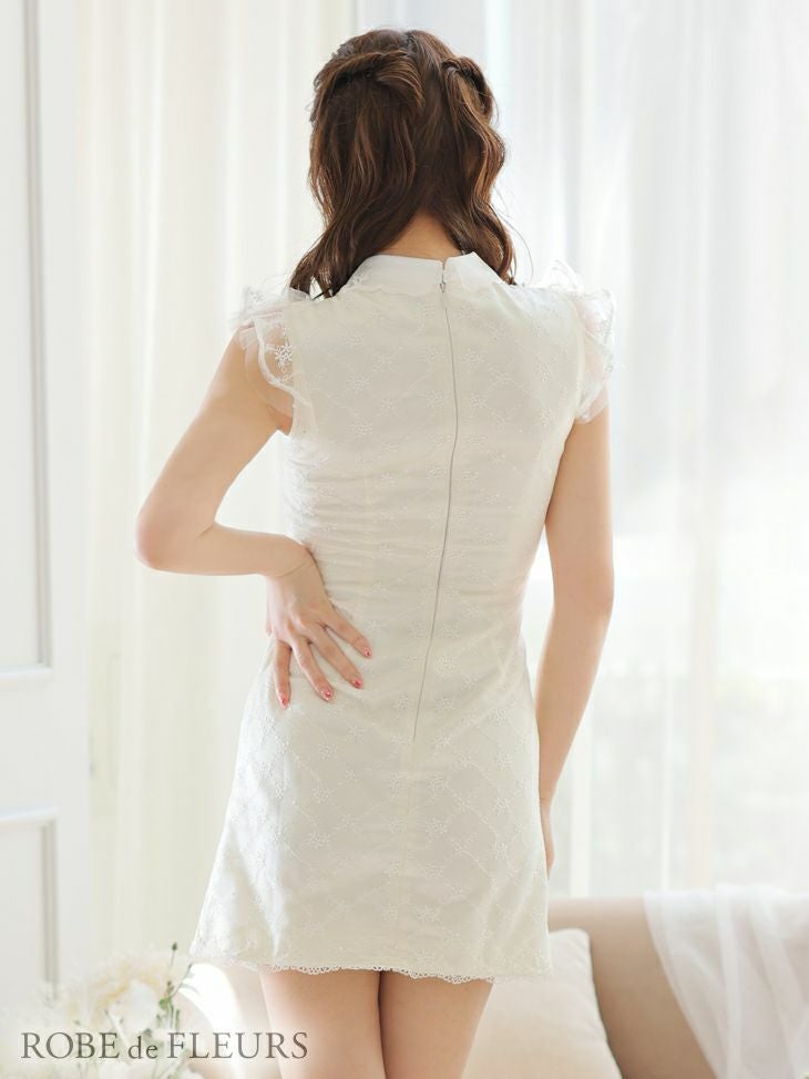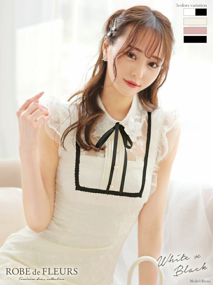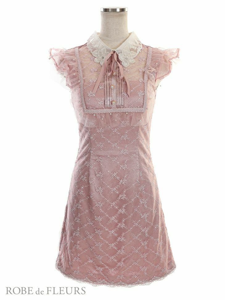 目を惹くフェミニンな一着☆ [ROBEdeFLEURS/ローブドフルール] 高級 襟付き ネックリボン 刺繍フラワーレース サロペ風 フリル袖 ノースリーブ 台形 フレアミニドレス