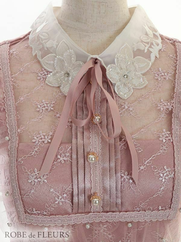 5. [ROBEdeFLEURS/ローブドフルール] 高級 襟付き ネックリボン 刺繍フラワーレース サロペ風 フリル袖 ノースリーブ 台形 フレアミニドレス