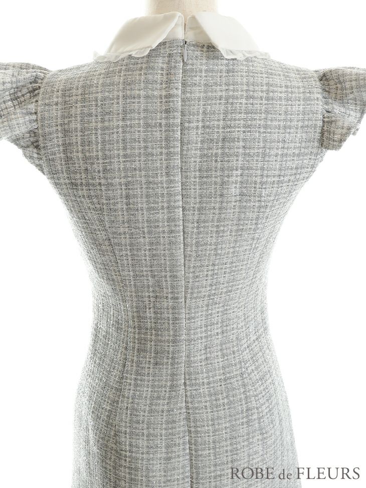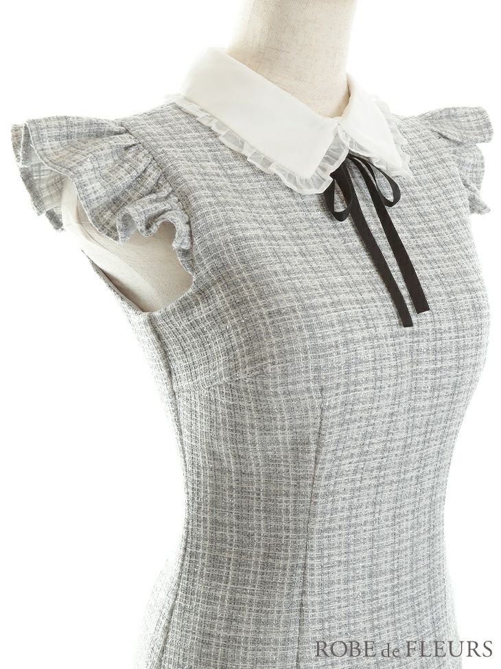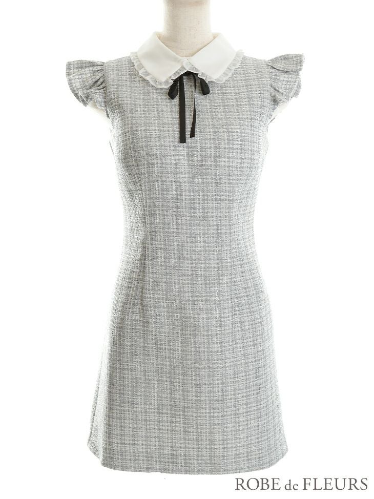 上品見え間違いなしの襟付きワンピ♡ SALE [ROBEdeFLEURS/ローブドフルール] 高級 フリル襟付き ラメツイード ネックリボン ノースリーブ フレアミニドレス