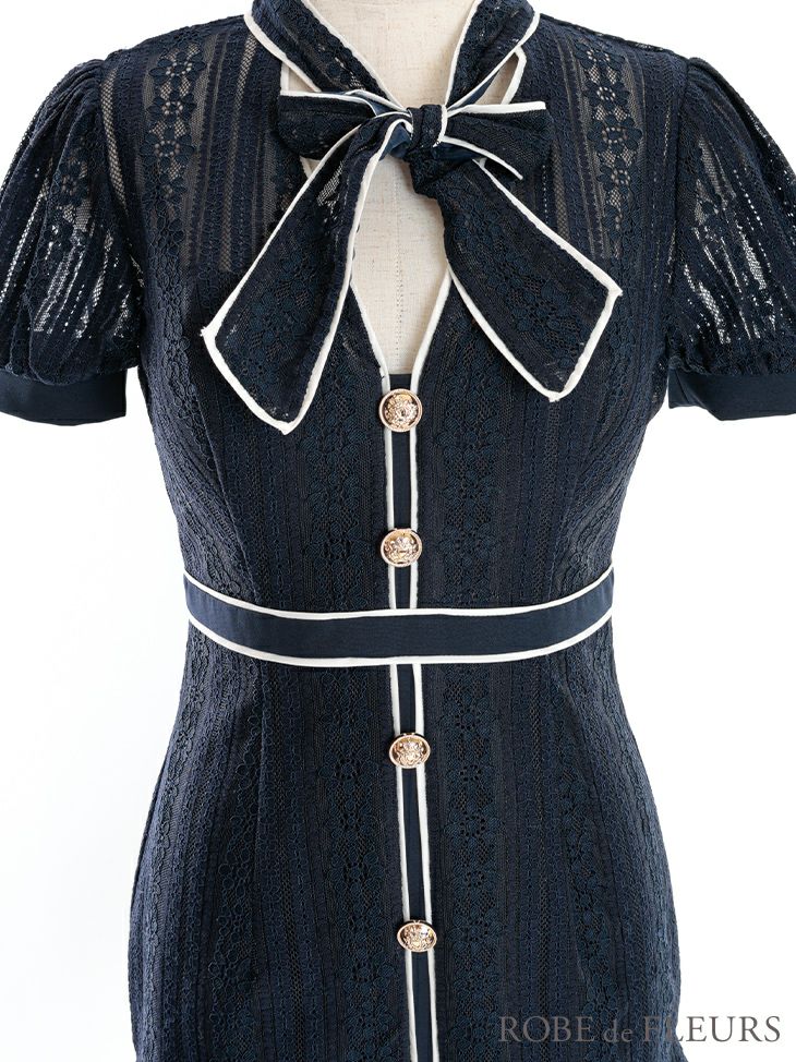 5. [ROBEdeFLEURS/ローブドフルール] 高級胸元ネックリボンフラワーレースバイカラー裾フリル半袖タイトミニドレス