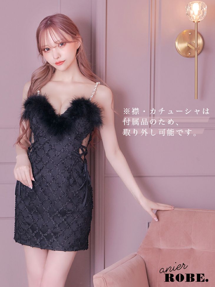 刺繍レース×ファーでフェミニンキュート☆ [ANIER./アニエル] 高級パステルカラー刺繍レースネックリボンツインガーリービジュー付キャミソールふわふわセクシーバニーミニドレス