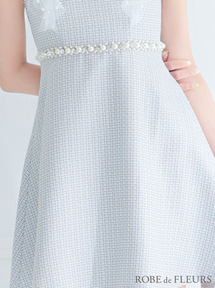 同伴やお食事に着ていくこともできます◎ [ROBEdeFLEURS/ローブドフルール] 高級パール付きチュールフリルツイードノースリーブネックリボンフレアミニドレス