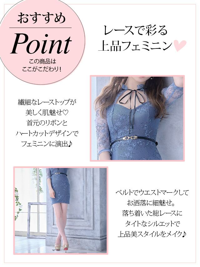 総レース袖ありハートカットウエストベルト切替ネックリボンタイトミニドレスの商品特徴
