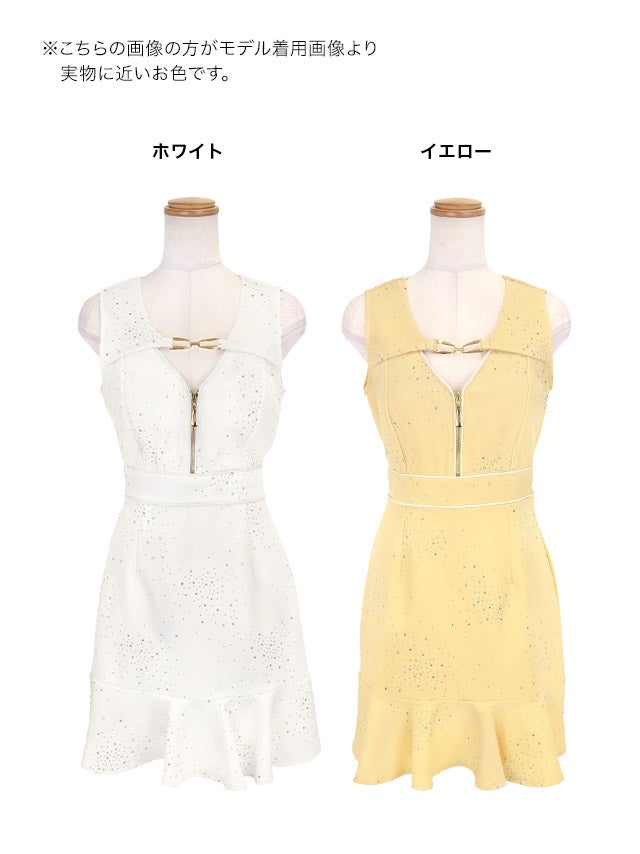 ミニドレス ノースリーブ ジップ 谷間 チェーン パイピング ビジューシャワー キラキラ 下着のまま 大きいサイズ XL XXL 裾フリル タイト イエロー キャバドレスのカラーバリエーション