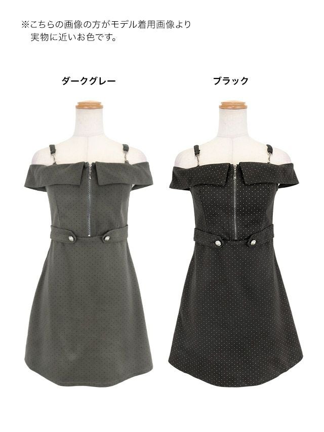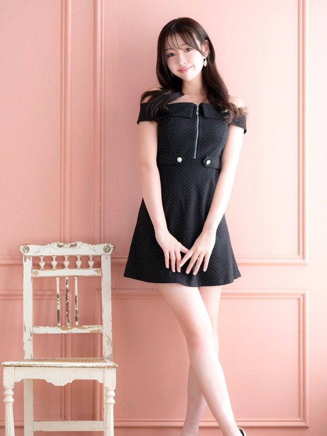 3. ワンピース Aライン ミニドレス ジップ 大人 ドット柄 肩出し ウエストベルト キャバドレス (雨宮由乙花着用)