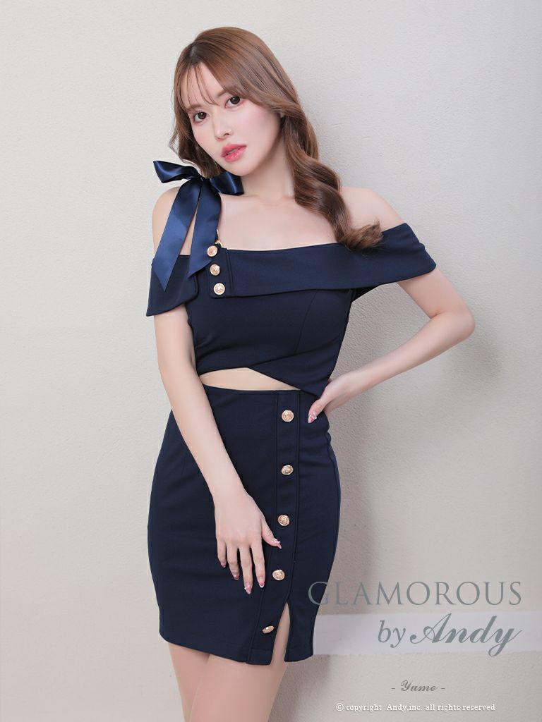 キャバドレス AndyGLAMOROUS アンディグラマラス 高級オフショルダーウエストカットゴールドボタンチェーンリボンスリットタイトミニドレス