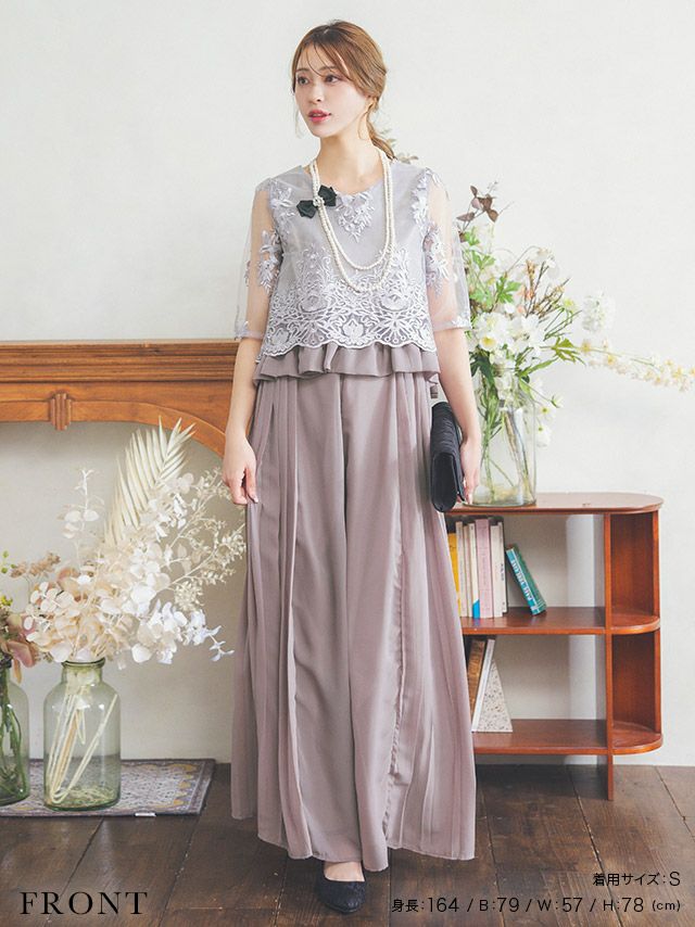 - [SALE] Vネックフラワー刺繍レース五分袖トップスシフォンドレープパンツツーピース結婚式パーティードレス [Retica/レティカ]