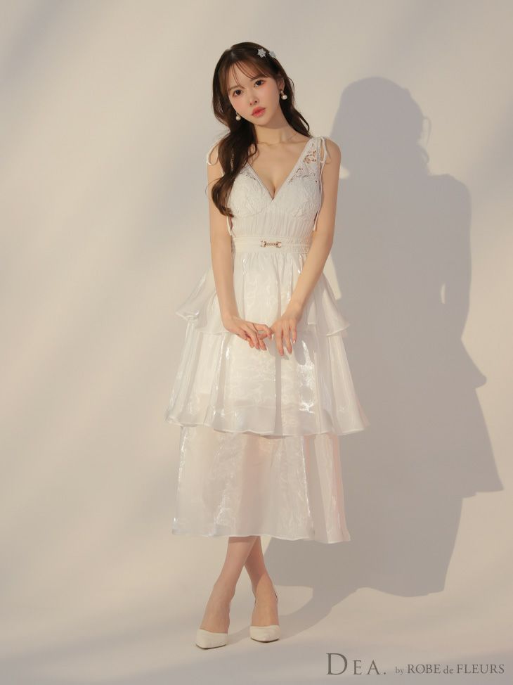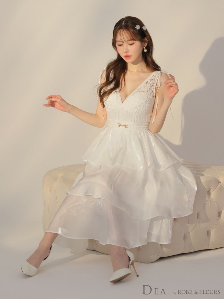 4. [DEA.byROBEdeFLEURS/ディアバイローブドフルール] 高級 バースデー ケミカルレース リボン ノースリーブ ティアード シフォン Aライン 膝丈ドレス