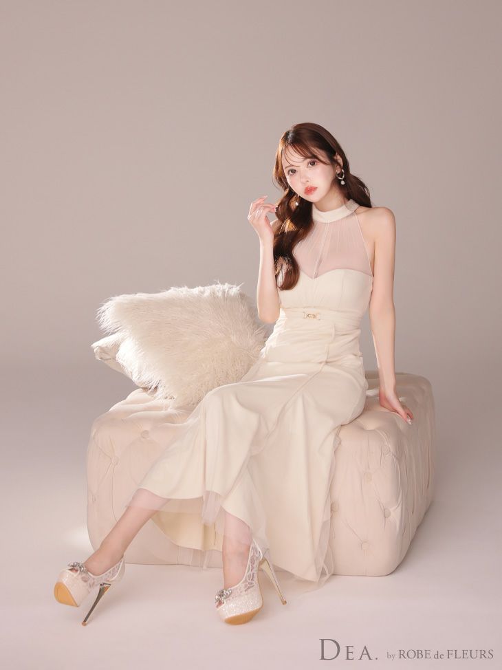 6. [DEA.byROBEdeFLEURS/ディアバイローブドフルール] 高級 バストシースルー ホルターネック ウエストベルト ネックリボン チュール 谷間魅せ Aラインロングドレス