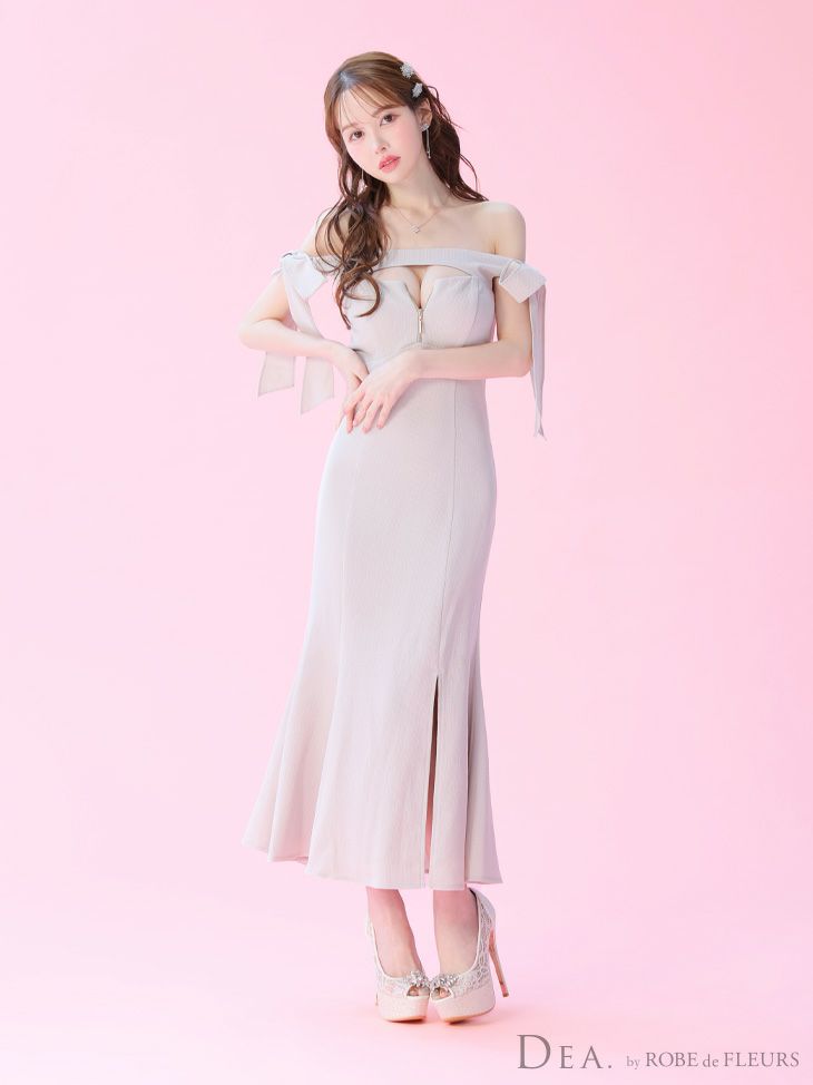 上品な可愛さを引き立てる♡ [DEA.byROBEdeFLEURS/ディアバイローブドフルール] 高級 ワンカラー バストカット ジップ リボン オフショルダー 谷間魅せ マーメイドロングドレス