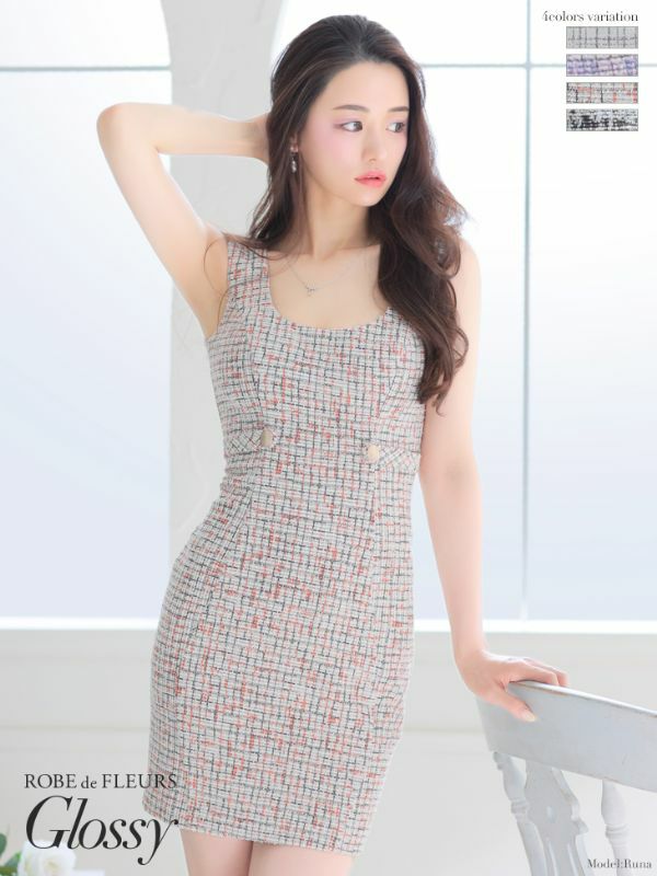 ROBEdeFLEURSGlossy ローブドフルールグロッシー 高級ノースリーブシンプルツイードウエストマークタイトミニワンピースドレス