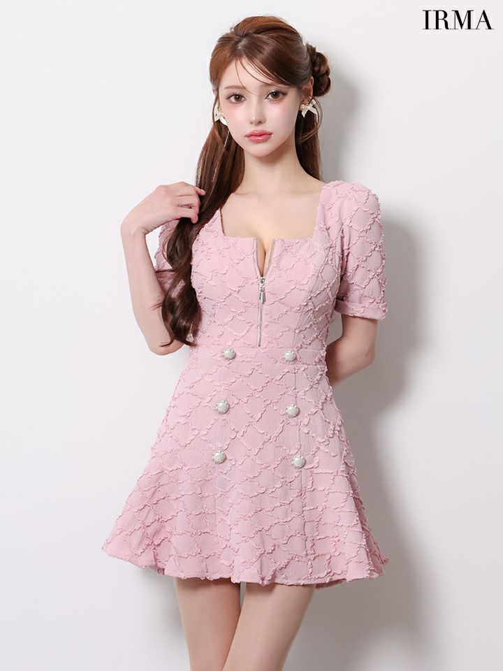 上品さと女性らしさを兼ね備えた1着♡ 予約商品【7月中旬入荷予定】[IRMA/イルマ] 高級 ブランド ワンピース Aラインミニドレス 谷間 ジップ 半袖 パールボタン