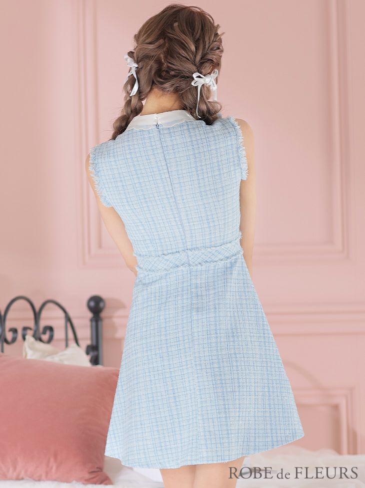 他の画像を見る ラメツイードドレス♡ [ROBEdeFLEURS/ローブドフルール] 高級 フリル襟付き ラメツイード ネックリボン ノースリーブ フレアミニドレス ¥ 28,380 税込 在庫切れ お気に入りに追加