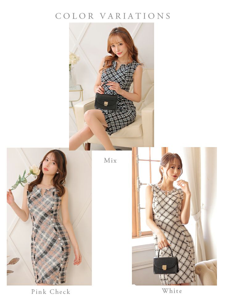 他の画像を見る 高級感溢れるタイトミニドレス♡ [ROBEdeFLEURSGlossy/ローブドフルールグロッシー] 高級 チェック柄 レザー風 襟付き フロントジップ ツイード ノースリーブ ファスナースリット タイトミニドレス ¥ 29,480 税込 在庫切れ お気に入りに追加