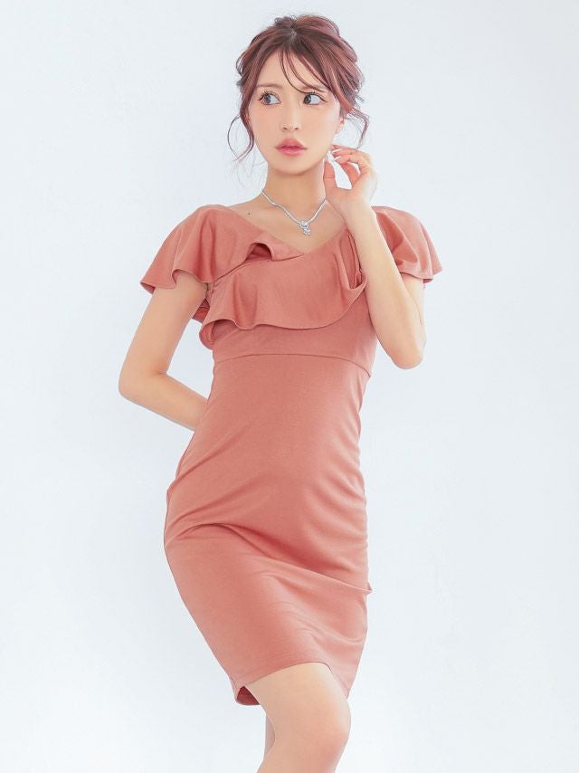 半袖 フリル袖 ワンカラー シンプル タイトミニドレスの全身フロント画像