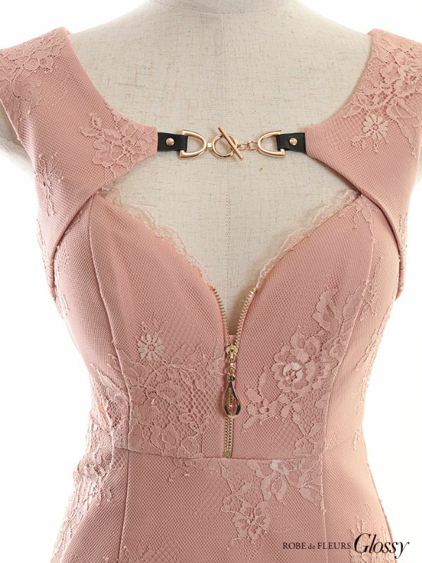 5. [ROBEdeFLEURSGlossy/ローブドフルールグロッシー] 高級 ノースリーブ バストカット サイド チュール切替 フラワー 総レース 谷間魅せ タイトロングドレス