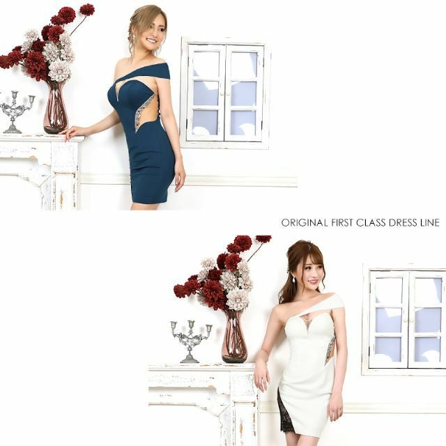 周囲と差をつけるデザインドレス☆ [Angel-R/エンジェルアール] 高級 バストカット サイドビジュー レース切替 ワンショルダー 谷間魅せ タイトミニドレス