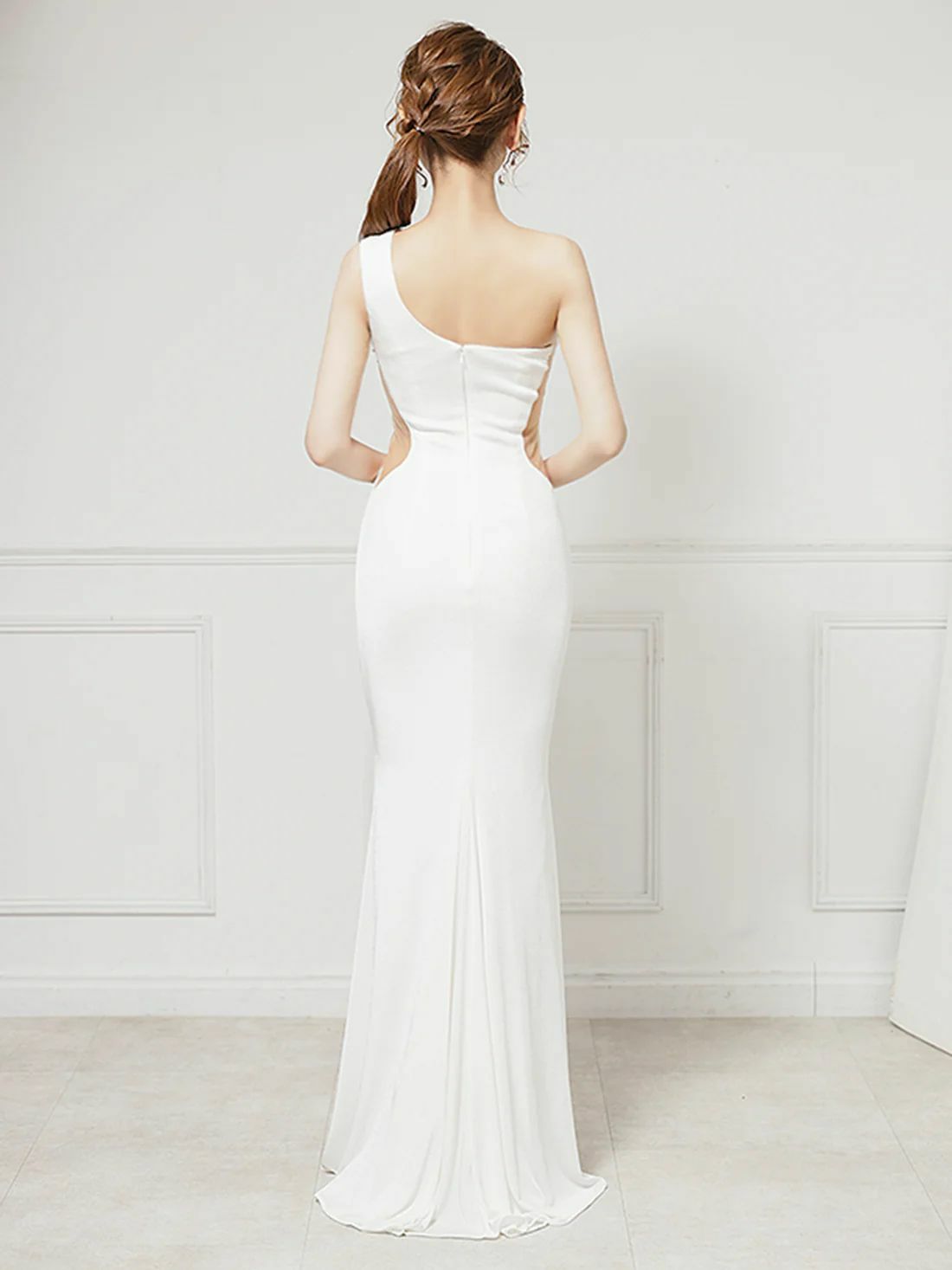 肩やデコルテを強調したワンショルダーの肌見せデザインは顔を小さく魅せてくれ