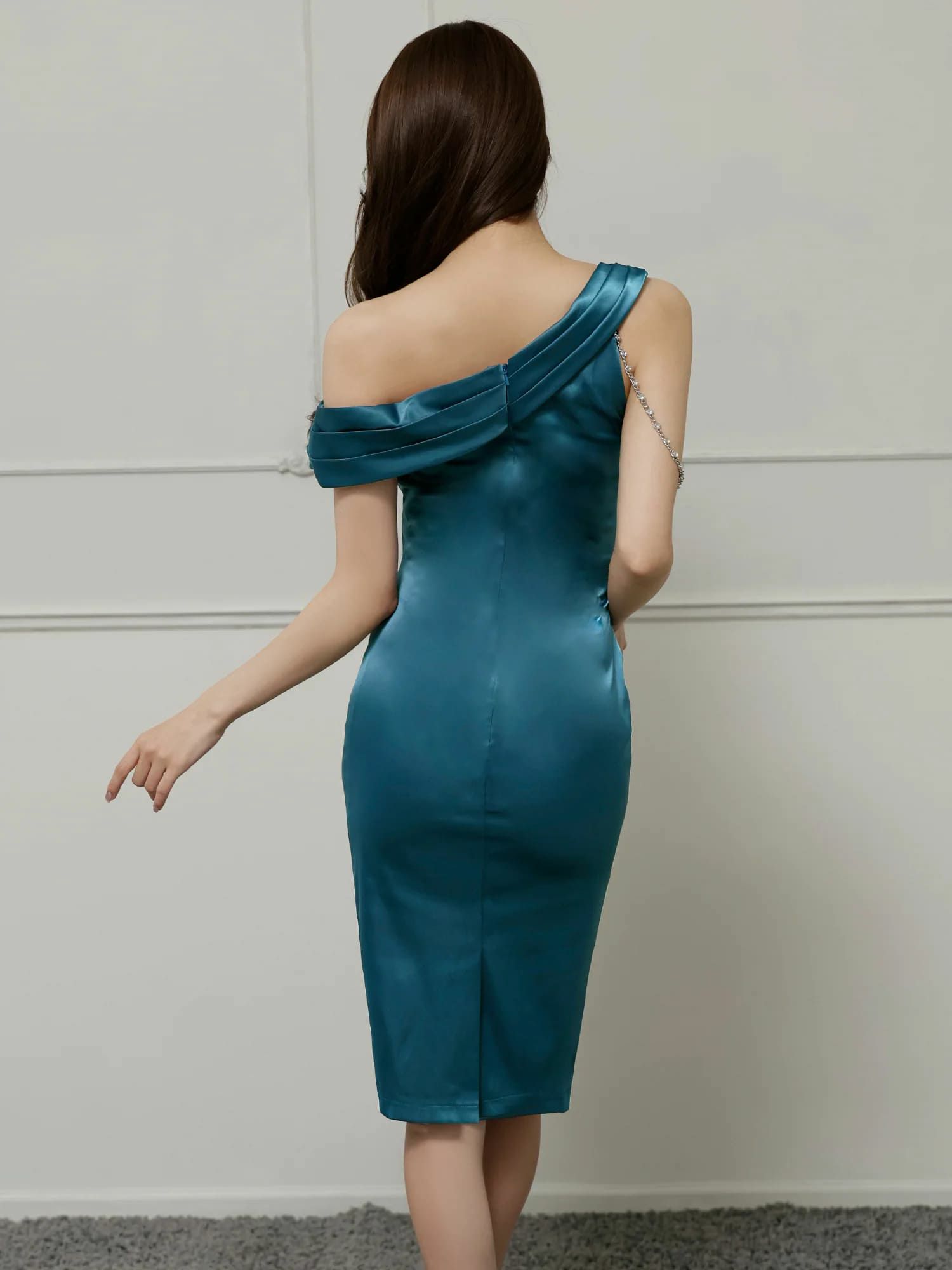 他の画像を見る ビジューチェーンが煌めきをプラス♡ [Veautt/ヴュート] 高級 ブランド タイト膝丈ドレス ワンショルダー ビジューチェーン ウエストタック サテン 大人 ワンカラー ¥ 28,380 税込 お気に入りに追加