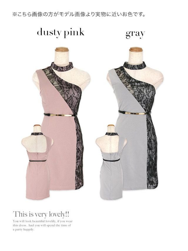 ワンショルダーチョーカーネックアシンメトリーブラックレース切替ウエストベルト付きタイトミニドレスのカラーバリエーション